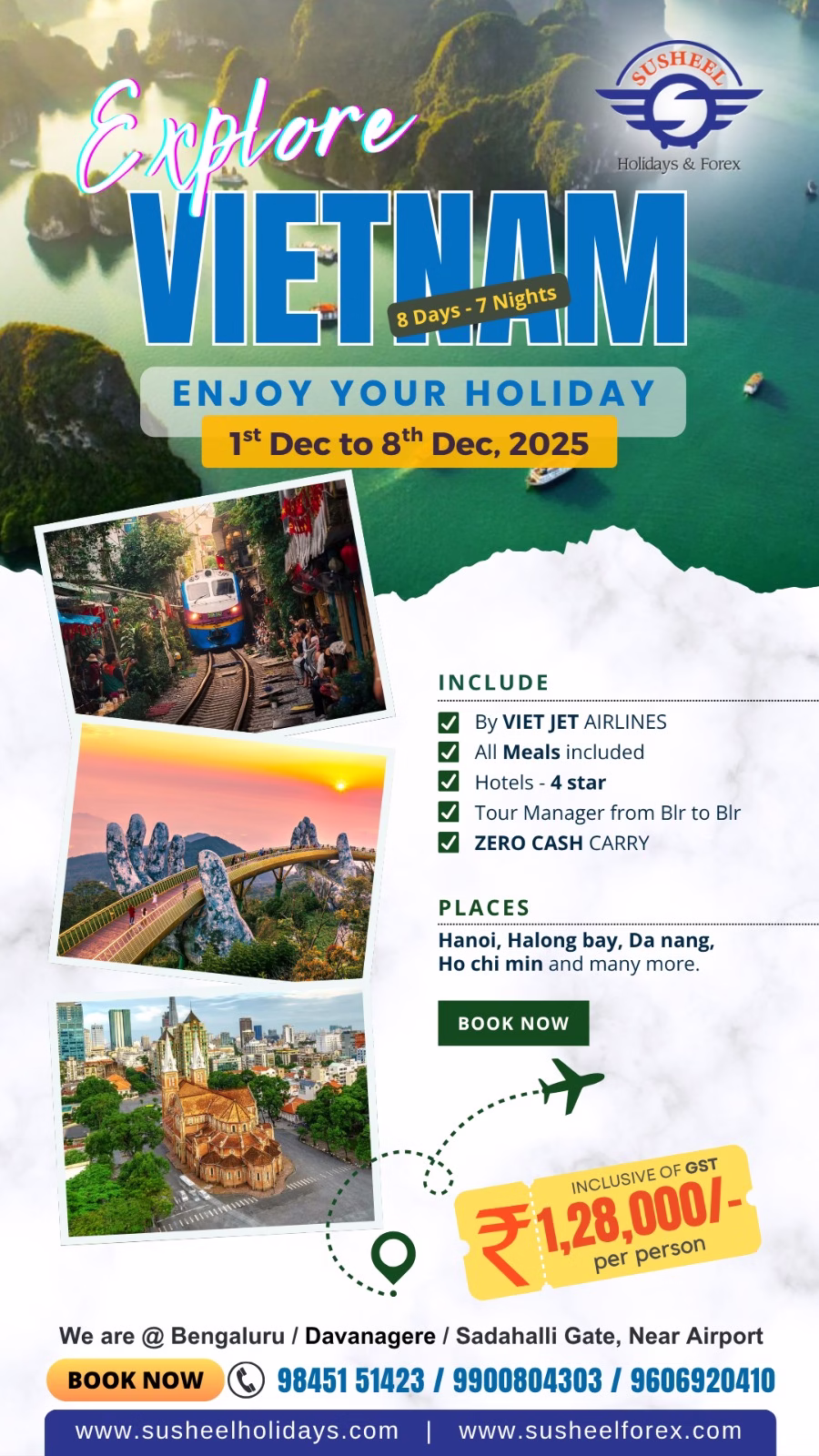 Posted on Kutty GopiTrustindex verifies that the original source of the review is Google. I have travelled Jammu and Kashmir trip with Susheel Holidays and Forex Private limited.. It was very well organized. Everything was taken care with utmost care.. We enjoyed the House boats, snow in phelgaum, Gulmarg, snoamarg.. It was the best experience of my life.. I trust Susheel holidays and recommend to everyone.. I will plan to travel more groups with Susheel holidays..Posted on veena pgTrustindex verifies that the original source of the review is Google. Absolutely recommended to book holidays with Susheel Holidays! I booked accommodation and travel for a 3 nights stay at Kollam, Kerala with family. They took care of everything and followed up for the flight landing time, so that the vehicle and driver are on time to pick us up. We used the tempo traveler for 3 days to go sight seeing in trivandrum and Kollam. The driver was very polite and accommodated all our needs since we needed pure veg restaurants (travelling with senior citizens).The resort booked (Fragrant Nature) was beautiful, the staff was very courteous and the stay was very relaxing. All our special dietary needs were fulfilled. Susheel Holidays staff, Ms.Manjula, did check up on us everyday if all was ok. I appreciate their attention to detail and customer centric service. She also promptly followed up for return journey and if we reached home back safely. Highly commendable service. I would highly recommend and would definitely book again for our holidays!!Posted on sunil kumarTrustindex verifies that the original source of the review is Google. We had the most magnificent trip to Thailand, all thanks to our Travel advisor, Madan! He organized every detail flawlessly, from booking fantastic accommodations at Krabi and Bangkok to arranging reliable transportation and exceptional tours. The drivers/tour guides he arranged, were always on time and knowledgeable. Madan was always available to answer our questions and provided excellent recommendations that made our trip even more special. The entire experience was stress-free, and we were able to enjoy every moment. We will definitely be booking with him for our next adventure.Posted on Ravi ThejaTrustindex verifies that the original source of the review is Google. It was well planned and got the best package. Good responsePosted on SarikaTrustindex verifies that the original source of the review is Google. We appreciate everyone's efforts in planning such a wonderful trip to Shillong and Guwahati. We stayed at a fantastic 3- star hotels with delicious food and warm service. I am grateful to Susheel Travels for organizing such a wonderful Driver and guide in a nice vehicle We had fantastic coordination and guidance during our vacation, therefore I would advise everyone to book with Susheel Travel and have a great time.Posted on KdscTrustindex verifies that the original source of the review is Google. It was very good traveling with Susheel holidays hospitality is really good thank you for making my trip memorablePosted on Shashi ReddyTrustindex verifies that the original source of the review is Google. Madhan reddy is sooo cooperative and good person plz visitPosted on Mahananda .S.HTrustindex verifies that the original source of the review is Google. So good happy for service they provide. So super fast. So Friendly and helpfull to customer 😊.Posted on Srushti Maruti NayakTrustindex verifies that the original source of the review is Google. Very well handling of situations related to passport, visa. They helped us with last minute things as well. Highly recommend this for your visa application, currency exchange.Posted on Manoj KumarTrustindex verifies that the original source of the review is Google. The respond towards the Customer is very good, they understand Situation of the customers and try to fullfill the needs accordingly. The service is very good and appreciated.